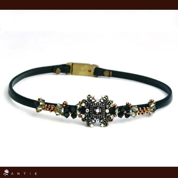 花のモチーフが美しい、スワロフスキービーズを革ブレスレットに付ければ、華麗なイメージに仕上がりました。